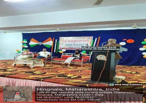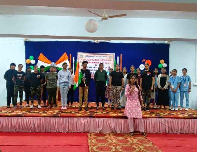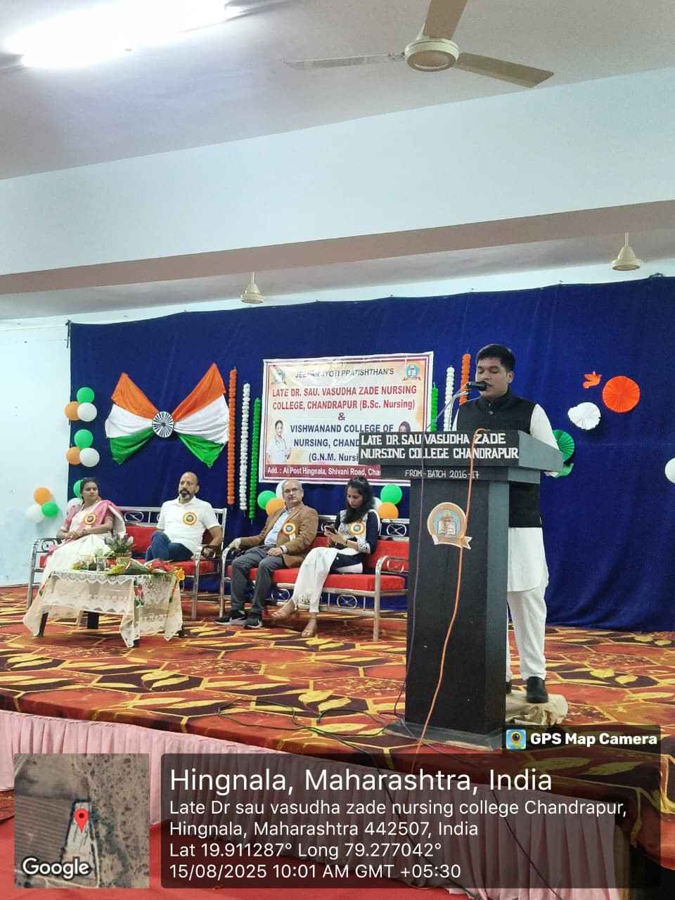 On the occasion of Independence Day, it was celebrated by late Dr. Sau Vasudha Zade College Chandrapur on 15 august 2025. The flag hosting done on 15 August 2025, at 9:05 Am Prof. Narendra Kolte Sir & Chief guest Vishwas Zade Sir. It was conducted at Late Dr. Sau Vasudha Zade Nursing College, Chandrapur which was attended by all the teaching & Non-teaching Staff & all the students. Independence Day was celebrated at Late Dr. Sau Vasudha Zade Nursing College, Chandrapur on 15 August 2025 by SNA Department. The celebration took place as per schedule, on 15 August 2025 at 9:00Am at Late Dr. Sau Vasudha Zade Nursing College, Chandrapur. The programme started with traditional lamp lighting ceremony by chief guest president of Jeevan Jyoti Pratisthan Dr. Vishwas Zade Sir & Vice President Dr. Nandali Zade mam of Jeevan Jyoti Pratisthan & Prof. Narendra Kolte Sir Principal LDSVZNC, Chandrapur. After that welcomed of floral banquet. After that welcoming dance was done by 7th SEM student & patriotic speech & patriotic song held by the students. After that speech given by Prof. Narendra Kolte Sir. After that skit performed by the BSc nursing 7th semester students. Almost all the class involved into the skit. After the skit performed by the 7th semester students, speech given by Dr. Vishwas Zade Sir President of Jeevan Jyoti Pratisthan. At the last the programmed was ended with vote of thanks by Ms. Siddhi Kuthe student of BSc nursing 4th semester.