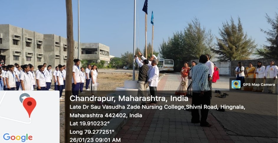 On the occasion of REPUBLIC DAY, it was celebrated by Late Dr. Sau Vasudha Zade Nursing College Chandrapur on 26 January 2023. The flag hosting done at 8:00 am by Dr. Vishwas Zade president & Prof. Narendra Kolte principal. The celebration started with traditional lamp lighting ceremony by the chief guest Dr. Kalpana Gulwade & Mr. Nikhilesh Pant & Welcome address given by Ms.Swati Khobragade clinical instructor of our college. After that, patriotic song and dance After that certificate given to the winner students. And programme came to an end.
