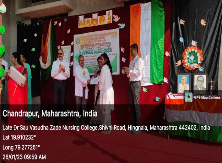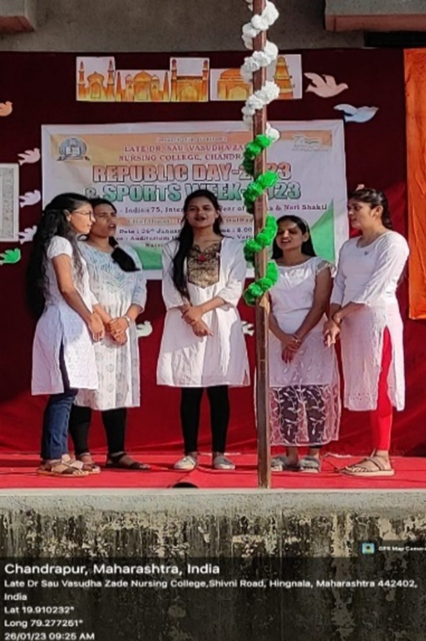 On the occasion of REPUBLIC DAY, it was celebrated by Late Dr. Sau Vasudha Zade Nursing College Chandrapur on 26 January 2023. The flag hosting done at 8:00 am by Dr. Vishwas Zade president & Prof. Narendra Kolte principal. The celebration started with traditional lamp lighting ceremony by the chief guest Dr. Kalpana Gulwade & Mr. Nikhilesh Pant & Welcome address given by Ms.Swati Khobragade clinical instructor of our college. After that, patriotic song and dance After that certificate given to the winner students. And programme came to an end.
