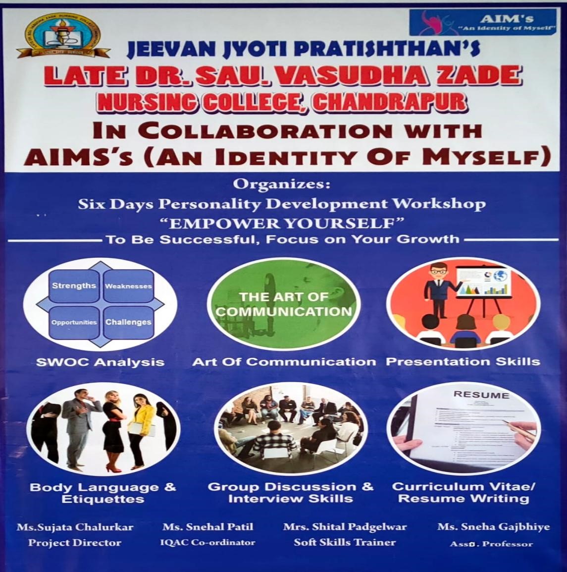 A six day workshop on “Personality Development Programme” was organized by Late Dr. Sau Vasudha Zade Nursing College Chandrapur, in collaboration with AIMS’S An Identity of Myself Chandrapur from 30th march 2022 to 6th April 2022 with theme empower yourself. … Continue reading Workshop on Personality Development