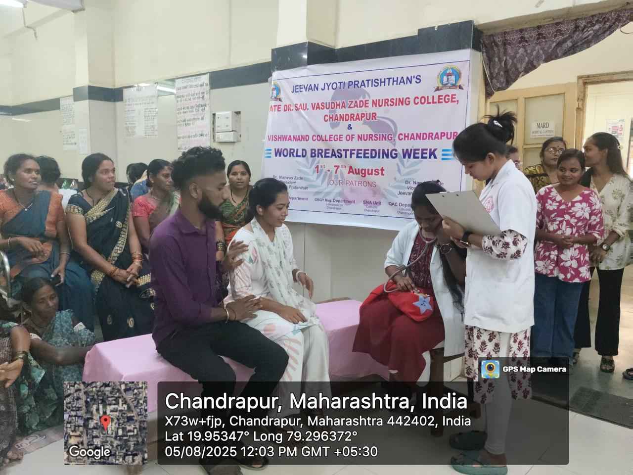 World breastfeedingweek-2025 was celebrated under the theme “Invest in breastfeeding, invest in the future” this week celebration was organized by OBGY Nursing, Child Health Nursing & community health nursing department of our college. This week is celebrated form 1-7th august every year, we celebrated this day for 2 day in which our first day i.e., 03/08/2025 celebration was held at government medical college and hospital, Chandrapur in this programme 7th semester students has performed skit on the topic of Postnatal care and assessment High risk newborn assessment. And on 06/08/2025 celebration was held at Vishwanand auditorium hall of our college, in which short introduction was given by Ms. Zebanaz sheikh Assistant Professor of our college on theme of this year following it our guest Dr. kalpana Gulwade and Dr. Manwatkar consultant OBG. Has given speech and at the end of the programme guest has evaluated the rangoli and poster making competition which was held on the theme of this year and cash prizes were given winner and runner up. And programme came to an end with vote of thanks.
